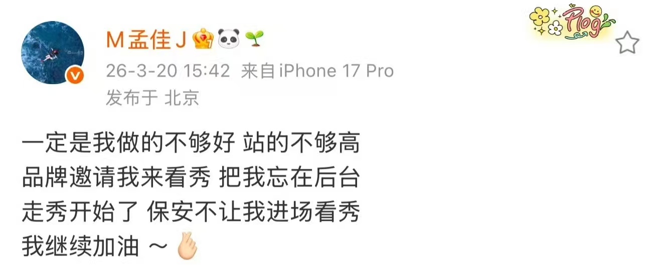 可孟佳按时赶到北京798秀场后,现实却给了她当头一棒。现场没有任何品牌工作人员接应,联系对接人也始终得不到回应,她只能独自在后台干等,这一等就是半个多小时。眼看着大秀马上开场,她却连入场的资格都没有,想要沟通进场,还被现场保安以没有有效凭证为由直接阻拦。满心诚意来赴约,最后却成了没人管的“局外人”,这场本该体面的看秀之行,彻底变成了一场让人难堪的闹剧。