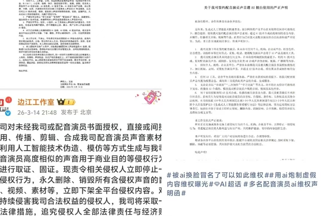 最近,不少配音演员联合起来公开维权,矛头直指一类侵权行为:有人未经允许,私自采集配音演员的声音用来训练AI模型,最后还靠这些AI语音赚钱牟利。这件事看似只是配音圈的风波,实则关乎AI技术发展的底线,也戳中了数字时代创作者权益保护的痛点。声音不是可以随便拿来用的免费素材,而是配音演员安身立命的本事,更是受法律保护的个人人格权益,随意盗用、商用他人声音,既是不尊重劳动成果,更是触碰了法律红线。