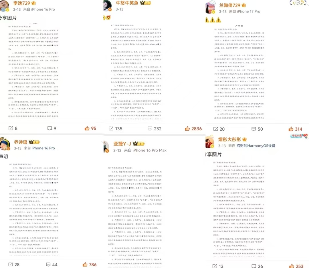 很多配音演员都发现,网上到处都是用自己声音做的AI语音,这些内容没有真人配音的情感和温度,还经常违背演员本人的意愿,有的甚至夹杂低俗、违规内容,不仅让配音演员的名誉受损,还不断稀释他们的职业价值。对配音演员来说,独特的声线、精准的语调,都是长年累月打磨出来的专业功底,每一段配音都藏着对角色的理解和情感的拿捏。未经授权的AI仿声,直接把这些心血当成“免费养料”,狠狠冲击了整个配音行业的生存根基。