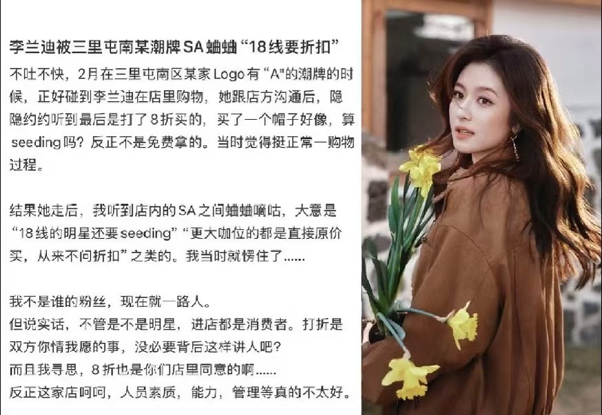 近日,演员李兰迪在北京三里屯一家潮牌店购物的小事,意外冲上舆论风口。据现场路人爆料,李兰迪当天挑选帽子时,正常跟店员沟通并成功申请到8折优惠,整个购物过程全程礼貌配合,没有任何额外要求。可没想到她刚离店,店内店员就私下出言嘲讽,直言其是“18线明星还要折扣”,还拿所谓大牌明星对比,暗讽她不够“体面”。这番私下议论被曝光后,立刻引发网友热议,大家纷纷讨论:消费者要折扣到底有错吗?服务行业又该守住哪些基本底线?