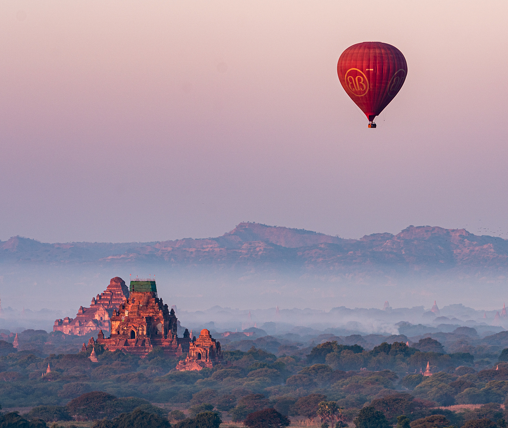 红砖佛塔的金顶在晨光里闪着微光,热气球缓缓掠过塔尖,把千年的静谧与浪漫揉进清晨的风里。
