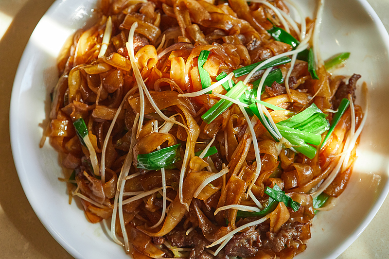 河粉被酱油炒得油亮焦香,裹着嫩滑的牛肉片,搭配脆嫩的豆芽与葱段,镬气十足。