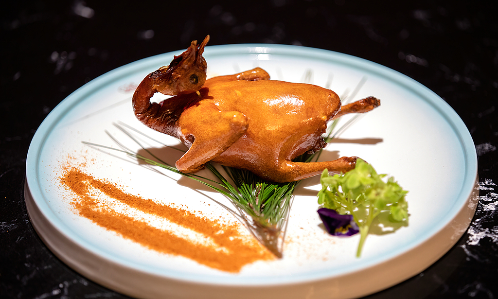 整只乳鸽烤至表皮红亮油润,外皮酥脆如纸,内里肉质鲜嫩多汁,搭配椒盐粉食用。