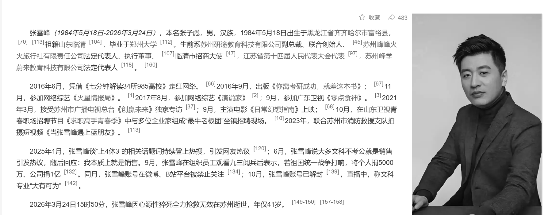2026年3月24日,张雪峰因心脏相关原因突发状况,经抢救无效,于江苏苏州离世,年未满42岁。消息当日下午在网络上迅速扩散,直到相关告示正式发布,仍有大量关注者难以接受这一事实。他的离去来得过于突然,许多人翻看他的社交动态,发现时间仍停留在3月22日,那一天,他完成了一次约7公里的跑步。
