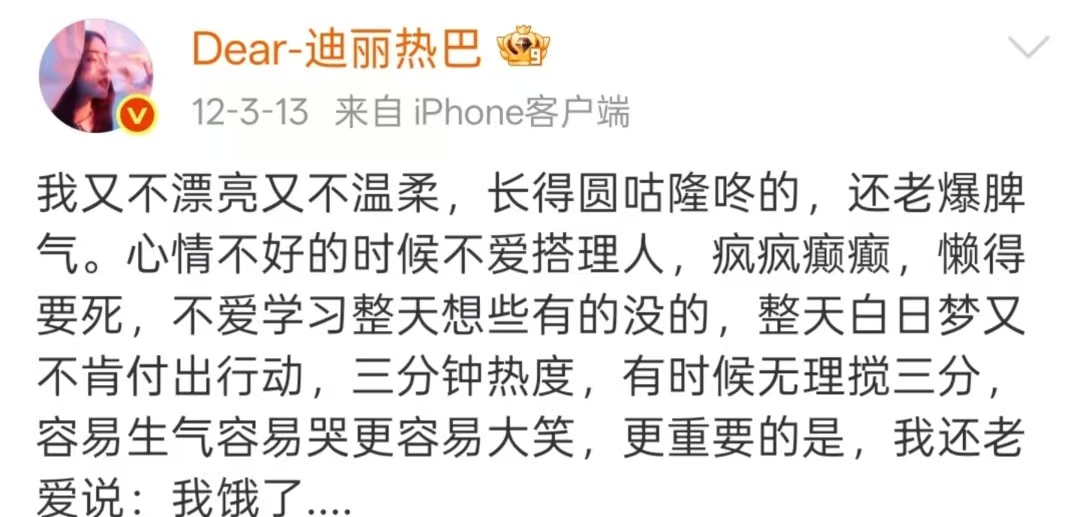 一条尘封了十余年的微博,突然在社交平台上掀起热议。2012年,年仅20岁的迪丽热巴还在上海戏剧学院读书,没有聚光灯环绕,也没有顶流光环,她在自己的微博里写下一段真心话:“我又不漂亮又不温柔,长得圆咕隆咚的,还老爆脾气”。这句不带任何修饰、满是少女心事的吐槽,如今被网友重新翻出,瞬间戳中了无数人的心窝,大家这才发现,原来镜头前光芒万丈的大明星,也曾和普通年轻人一样,在青春里陷入自我怀疑,被自卑和迷茫包围。