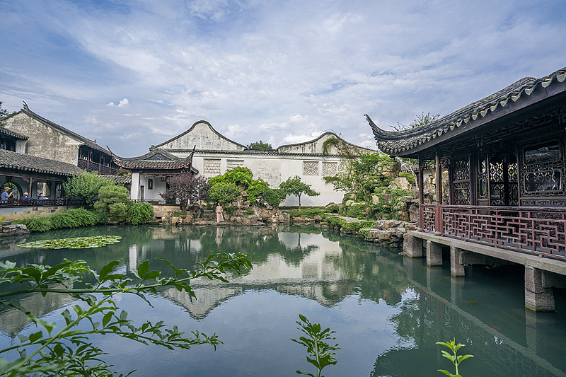 晴日里的园林澄澈明亮,粉墙黛瓦倒映在绿波里,亭台回廊的木色与绿植相映,游人在廊下闲坐,把江南的闲适与安逸都写进了时光里。