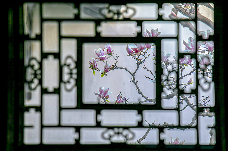 黑檀木花窗框住满枝玉兰,粉紫花瓣在素白墙前舒展,漏窗的纹样与花枝交织,把春日的温柔都框进这一方天地,是苏式园林最细腻的浪漫。