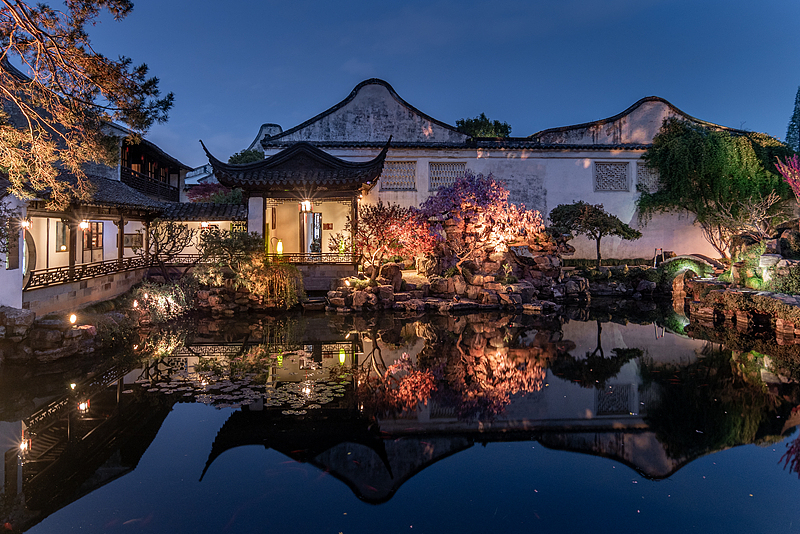 夜色里的园林灯火点点,飞檐翘角的剪影映在池面,红枫与绿树在暖光里晕染,水面如镜,连风都带着江南的温润,这是最动人的苏式夜宴。