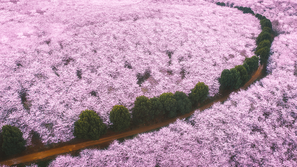粉白樱花在山间层层叠叠,小路在花海中蜿蜒穿梭,像一条通往春天的隧道,每一步都踩在温柔的花影里。
