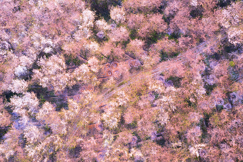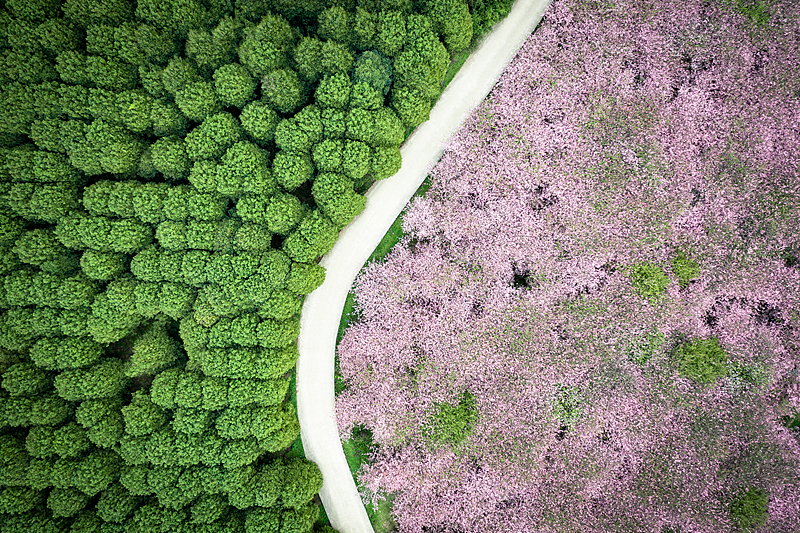 一条白路将画面劈成两半,一侧是墨绿森林,一侧是粉紫花海,强烈的色彩对比像上帝画下的分界线,尽显春日的视觉张力。