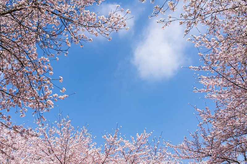 粉白樱花在湛蓝天空下肆意绽放,花枝交错间漏下点点白云,像把春天的温柔都写进了这方小小的天空里。