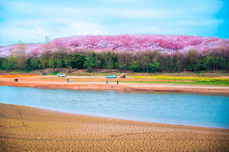 红土小路在粉色花海中蜿蜒,两侧是望不到头的樱花林,像一条通往春天的红毯,开车穿行其中,连风都带着花香。