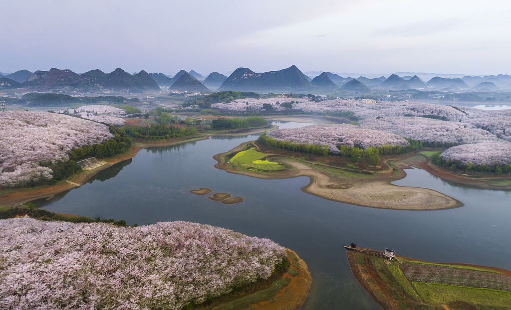 喀斯特峰林在薄雾中若隐若现,万亩樱花沿着湖岸铺展,粉白花海与碧绿湖水相映成趣,像把整个春天的温柔都揉进了贵州的山水里。