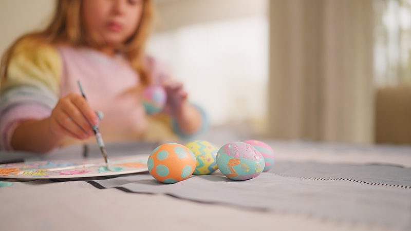 阳光正好的书桌前,扎着可爱发型的小女孩手持画笔,全神贯注地给空白彩蛋上色,专注的小模样格外动人。桌面上摆满了已经完成的波点、条纹款彩蛋,色彩斑斓各具特色,亲手绘制彩蛋的过程,不仅是创意的发挥,更是复活节里最温柔的亲子时光,在一笔一画间,传递着节日的温暖与传承。