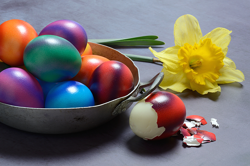 复古质感的金属托盘里,满满当当堆叠着彩虹色系的复活节彩蛋,红、黄、蓝、绿交织成春日最绚烂的色彩。旁边摆放着轻轻剥开的红色蛋身,搭配一束清新淡雅的黄水仙,暖调光影温柔地笼罩着整个画面,将复活节经典的传统仪式感展现得淋漓尽致,每一颗彩蛋都承载着新生的希望与祝福。