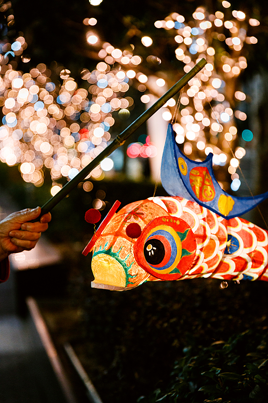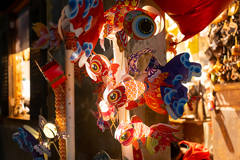 黄绿渐变的鱼灯带着江南的温润,鱼鳞用层层叠叠的水波纹手绘,鱼眼是精致的纸糊圆轮,头顶还缀着两颗红绒球。这是宁波鱼灯的特色,更偏向细腻的工笔风格,纹样多取自江河湖海的水纹,寓意 “如鱼得水、顺风顺水”,是江南水乡独有的温柔年味。