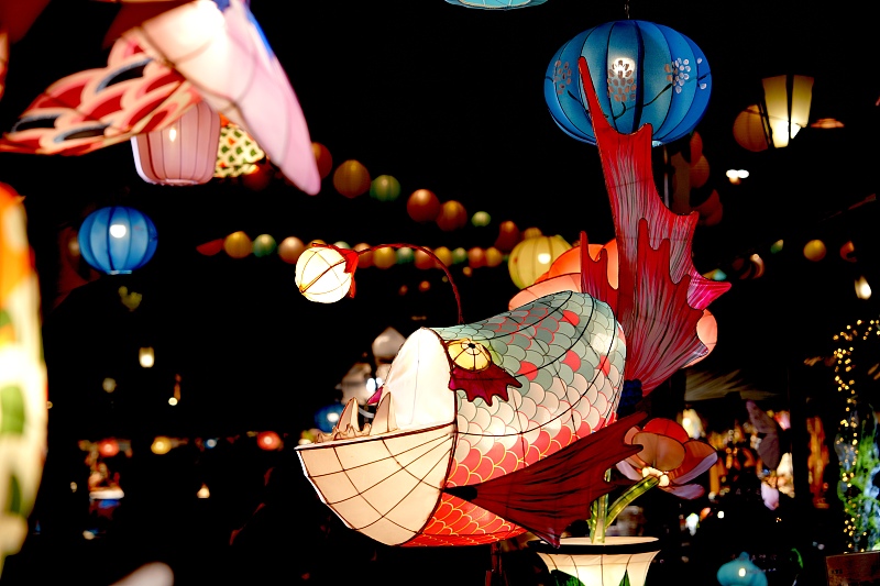 一只憨态可掬的大鱼灯张着嘴,红白相间的鱼鳞在灯光下泛着温润的光,鱼尾舒展如蝶翼,周围环绕着蓝、粉、红的各式灯笼。这是现代非遗鱼灯的创新表达,在保留竹骨纸衣的基础上,融入更夸张的造型与更丰富的色彩,让老手艺在当代灯会里,依然能惊艳所有人。