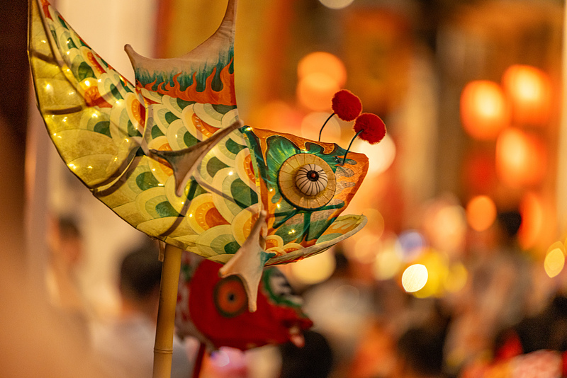 一只通体红金的鱼灯在人群中格外醒目,鱼鳞用白色云纹勾勒,鱼尾与鱼鳍缀着翠绿火焰纹,圆睁的绿眼透着灵动。这是典型的徽州鱼灯形制:以竹篾为骨架,糊上桑皮纸或宣纸,再用矿物颜料手绘纹样,灯身轻盈却坚韧,点亮后透光却不刺眼,是老手艺人们代代相传的智慧。