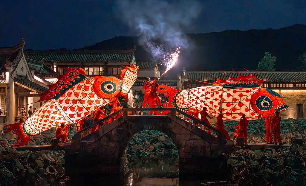 宏村的石桥上,两只巨型鱼灯相对而游,红衣艺人举着烟花在中间舞动,徽派古建的飞檐与荷塘的残叶,都成了这幕非遗大戏的背景。这是徽州鱼灯最具代表性的场景:鱼灯不仅是灯,更是连接过去与现在的纽带,用最鲜活的方式,让千年非遗在烟火里代代相传。