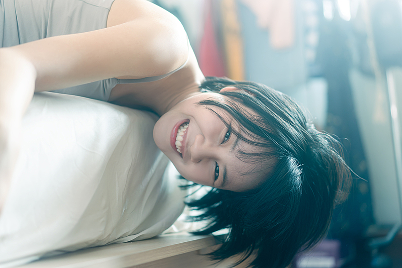 图片来源:视觉中国# 甜妹写真 #治愈笑容 #居家风 #短发少女x in bedroom after wake up in morning. Eye looking at camera.