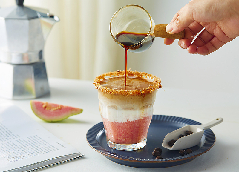 当番石榴的清甜遇上咖啡的醇厚,层次分明的渐变里藏着生活的仪式感。椰蓉杯沿锁住温柔,浓缩液缓缓落下,像把时光都酿成了一杯可以喝的诗。