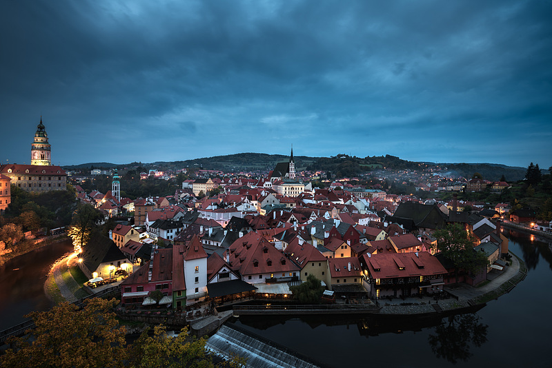 捷克克鲁姆洛夫(CK 小镇)的蓝调时刻,伏尔塔瓦河环绕着红屋顶小镇,古堡塔楼亮起暖光,中世纪的温柔在夜色里缓缓流淌🌙
