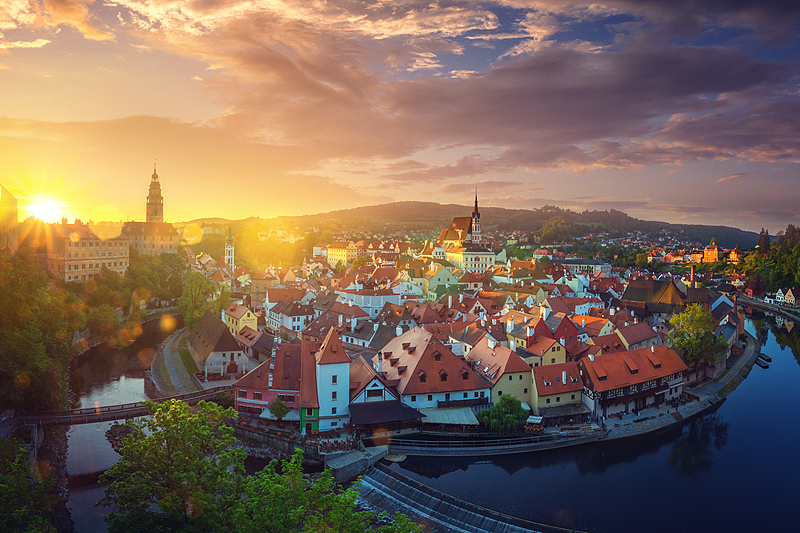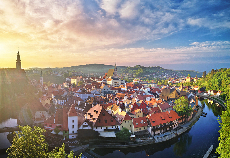 捷克克鲁姆洛夫的全景日出,朝阳漫过红屋顶小镇,伏尔塔瓦河映着霞光,整个 CK 小镇都浸在温柔的金色里🌅