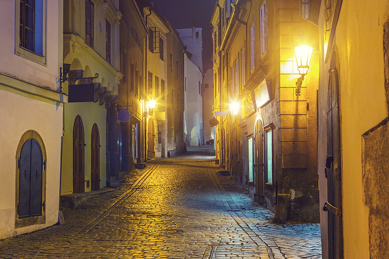 捷克克鲁姆洛夫的石板街夜景,暖黄路灯照亮中世纪街巷,复古石墙与木门,藏着 CK 小镇最地道的波西米亚烟火气🏮