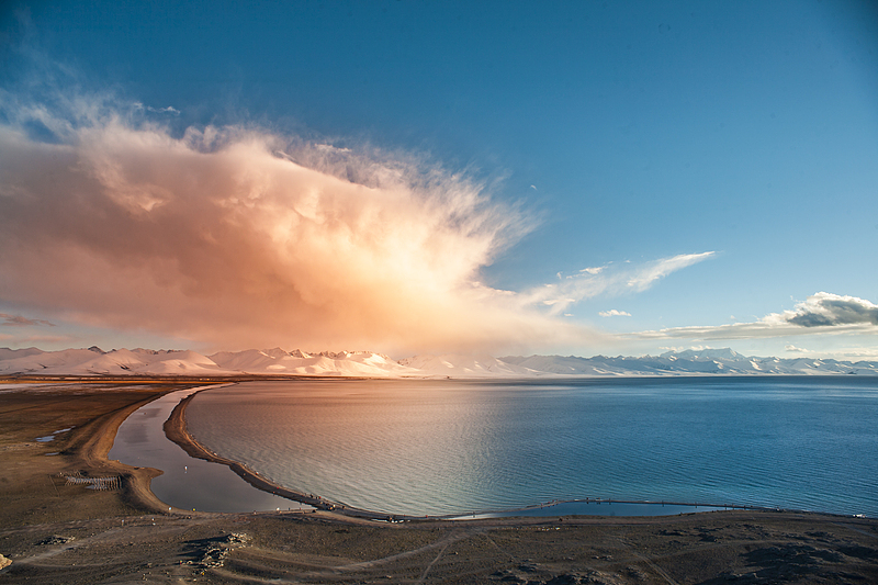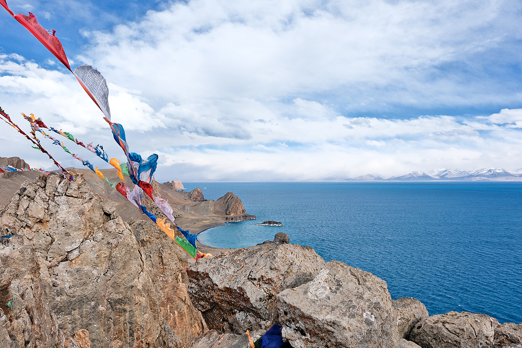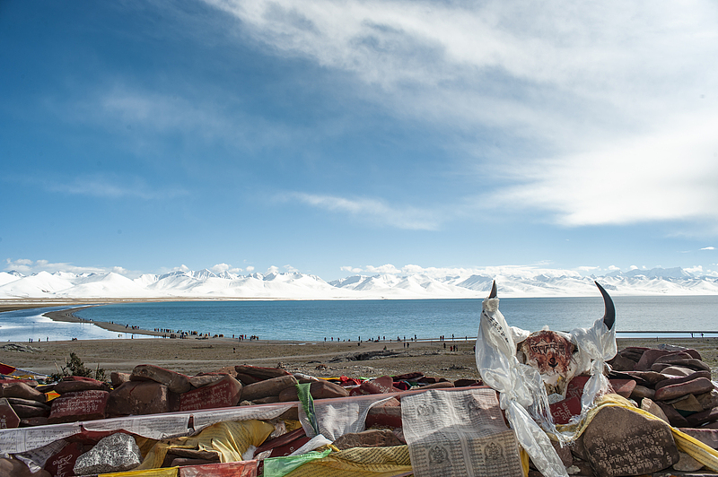 那是天湖的颜色,蓝得深邃,蓝得纯粹。远处的念青唐古拉山如卫士般守护,近处的经幡随风猎猎作响。