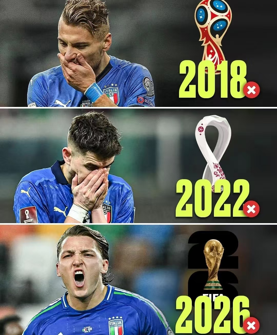 谁也没想到,这支2006年在“电话门”阴影下还能夺得世界杯冠军、2021年捧起欧洲杯的球队,会陷入连续三届无缘世界杯的困境。从2018年附加赛输给瑞典,到2022年被北马其顿绝杀,再到如今点球不敌波黑,八年时间里,意大利队三次倒在世界杯预选赛的最后一关,从豪门变成了附加赛的“常客”,曾经的四星荣耀,如今早已蒙上了阴霾。
