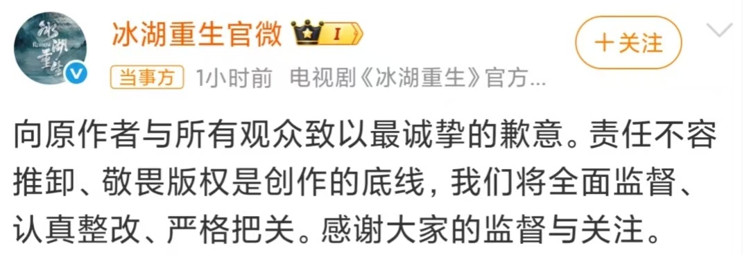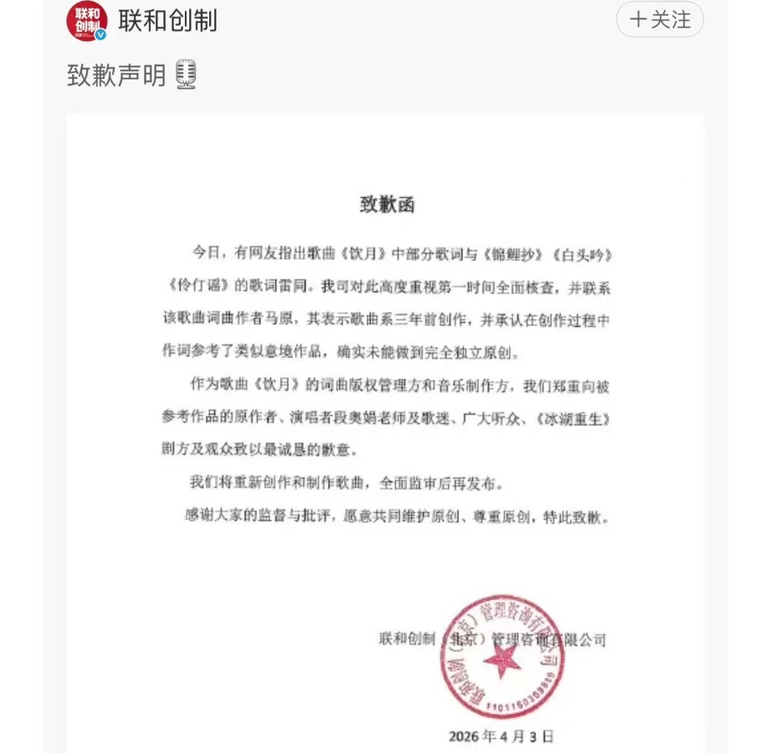 争议在网上发酵后,《冰湖重生》的相关方没有回避,很快就给出了回应。在4月3日发布的致歉声明里,他们首先向这三首经典歌曲的原作者、版权方,还有喜欢古风音乐的听众、电视剧的观众道了歉,明确承认《饮月》的歌词创作存在“过度借鉴”的问题,不是不小心造成的,而是创作和审核的时候没把好关,出现了疏漏。