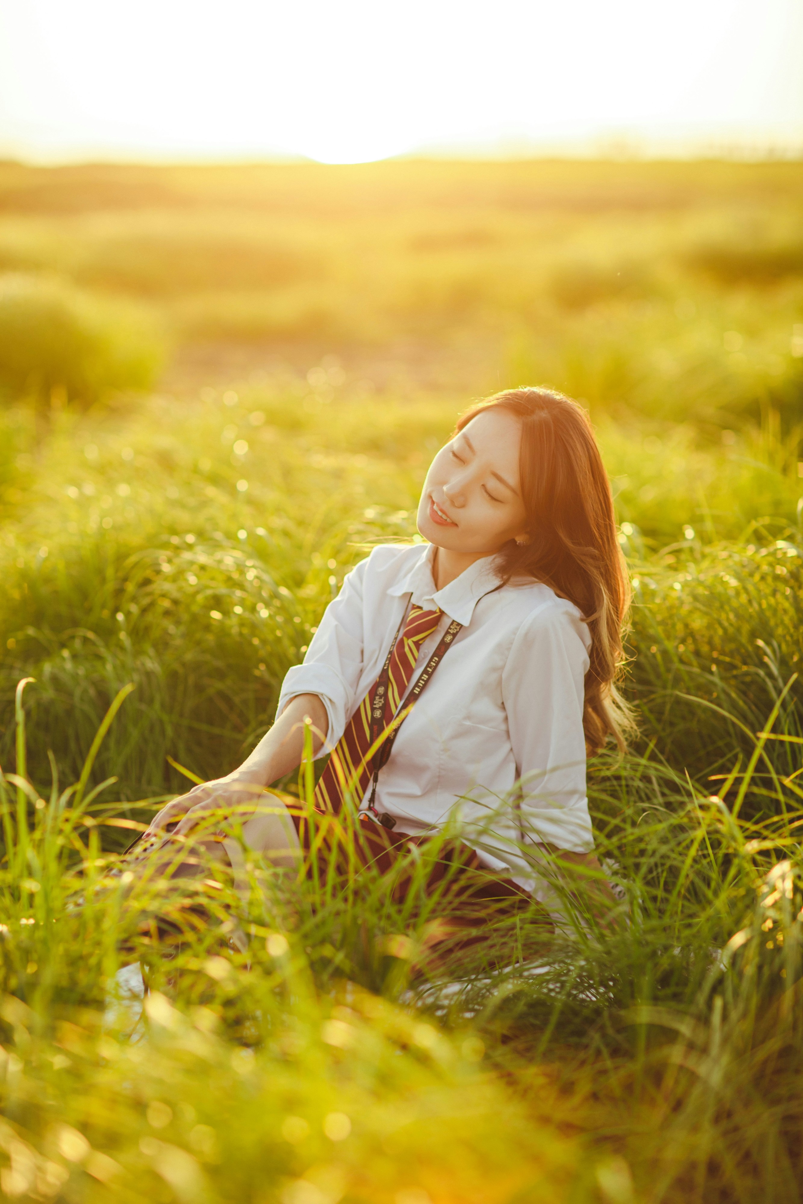 落日草地间,少女静坐于草丛,笑意浅浅,眉眼温柔。白衬衫红领带,把校园的松弛与青春的治愈,都定格成永恒。阳光洒在发梢,满是岁月静好的温柔。