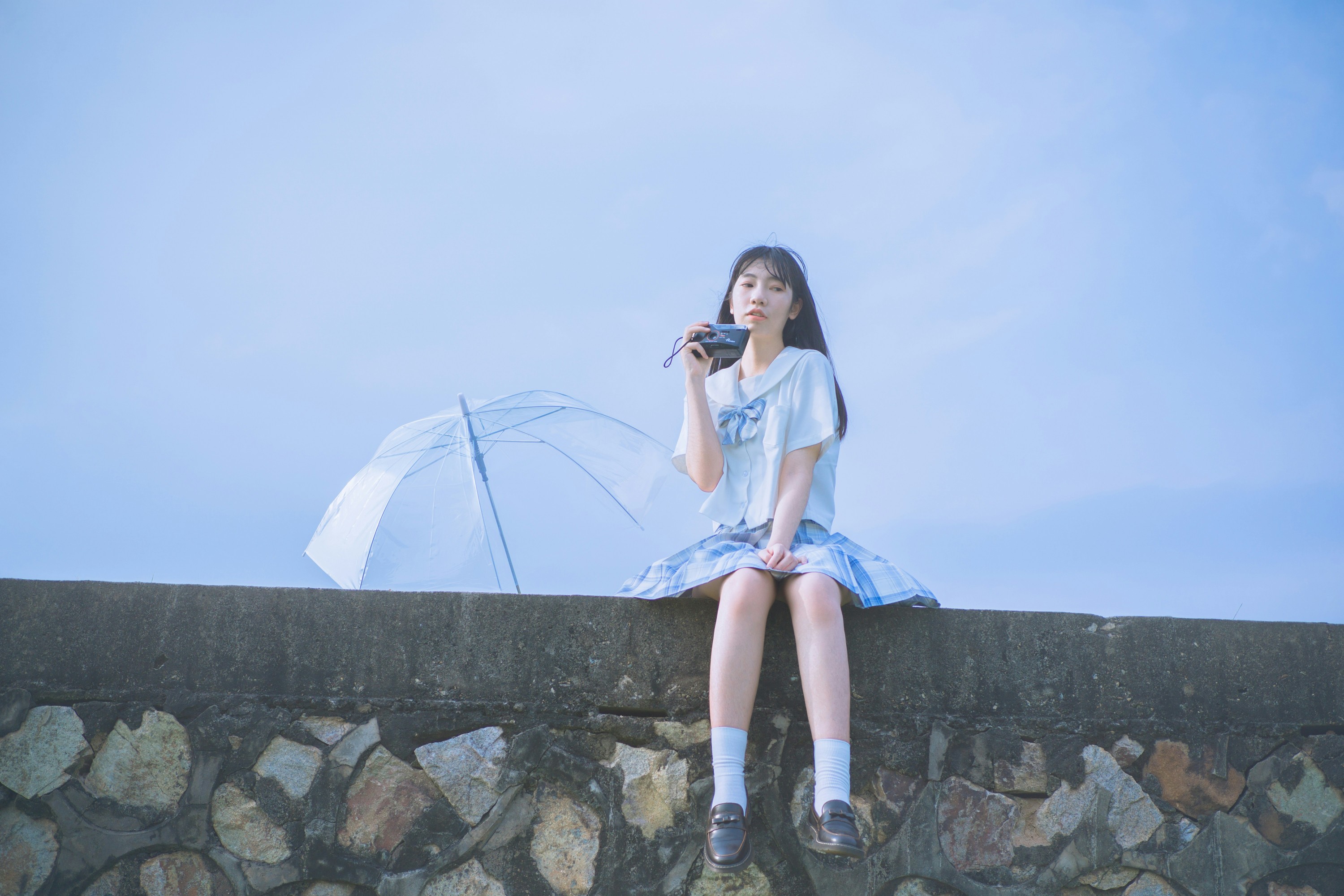 蓝天为幕,高台为台,少女静坐于石墙上,手持相机,身旁放着透明伞。白衬衫格裙,满是青春的灵动与自由,把夏日的美好与松弛,都写进这帧画面里。