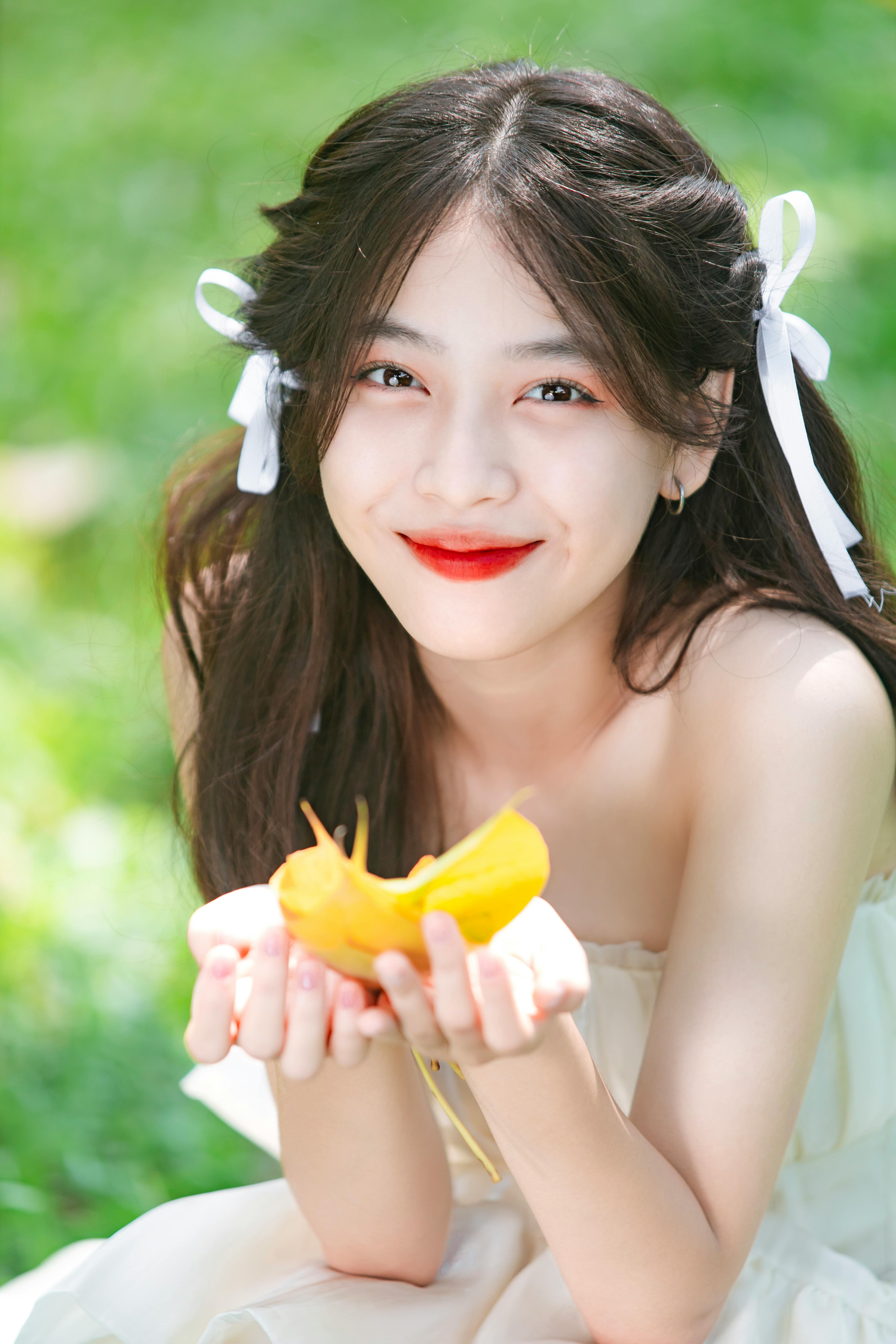 掌心捧着鲜黄杨桃,笑意明媚如春日暖阳,眼底盛满了纯粹的温柔。