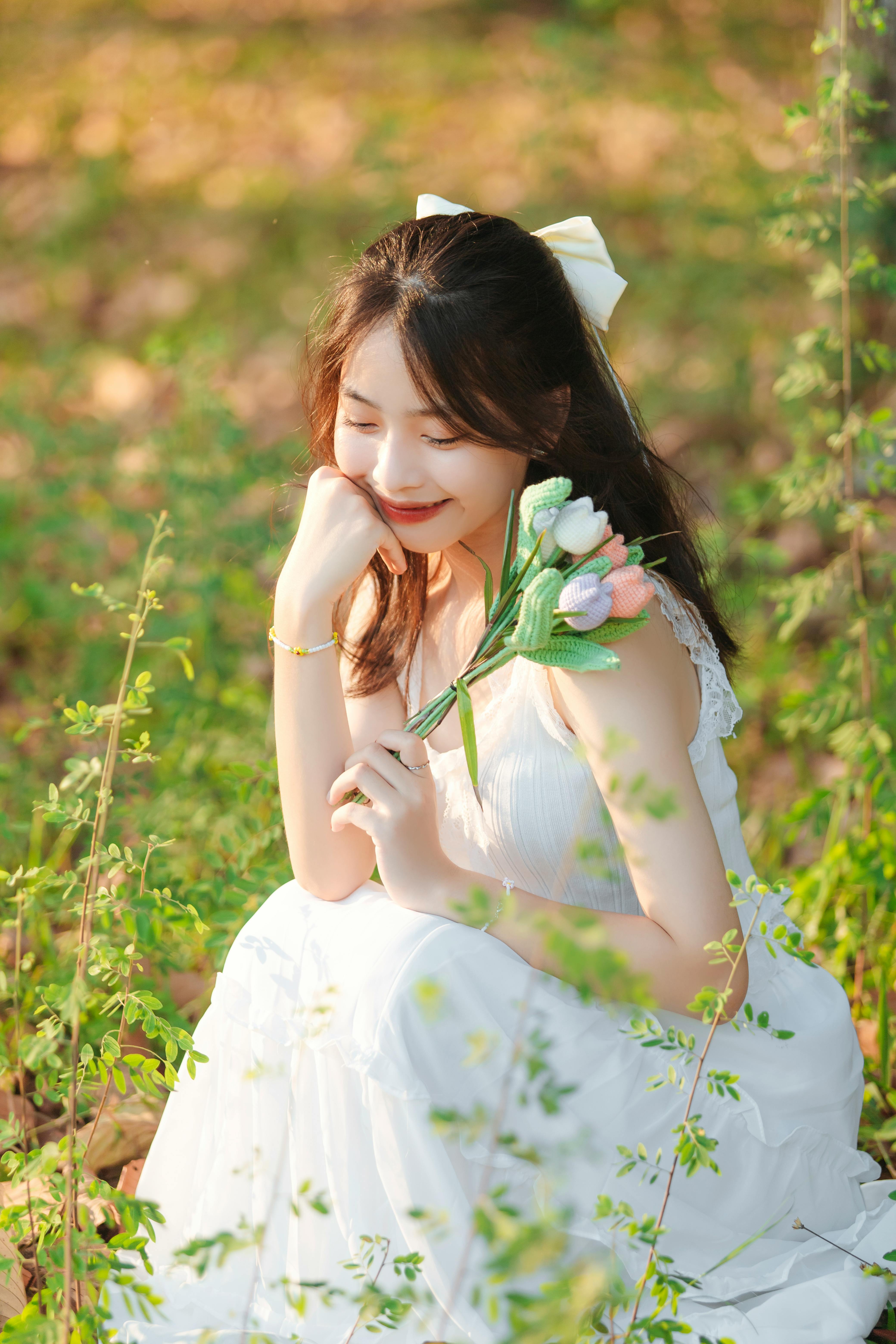 手捧花束托腮浅笑,眉眼弯弯,满是少女的娇羞与温柔。