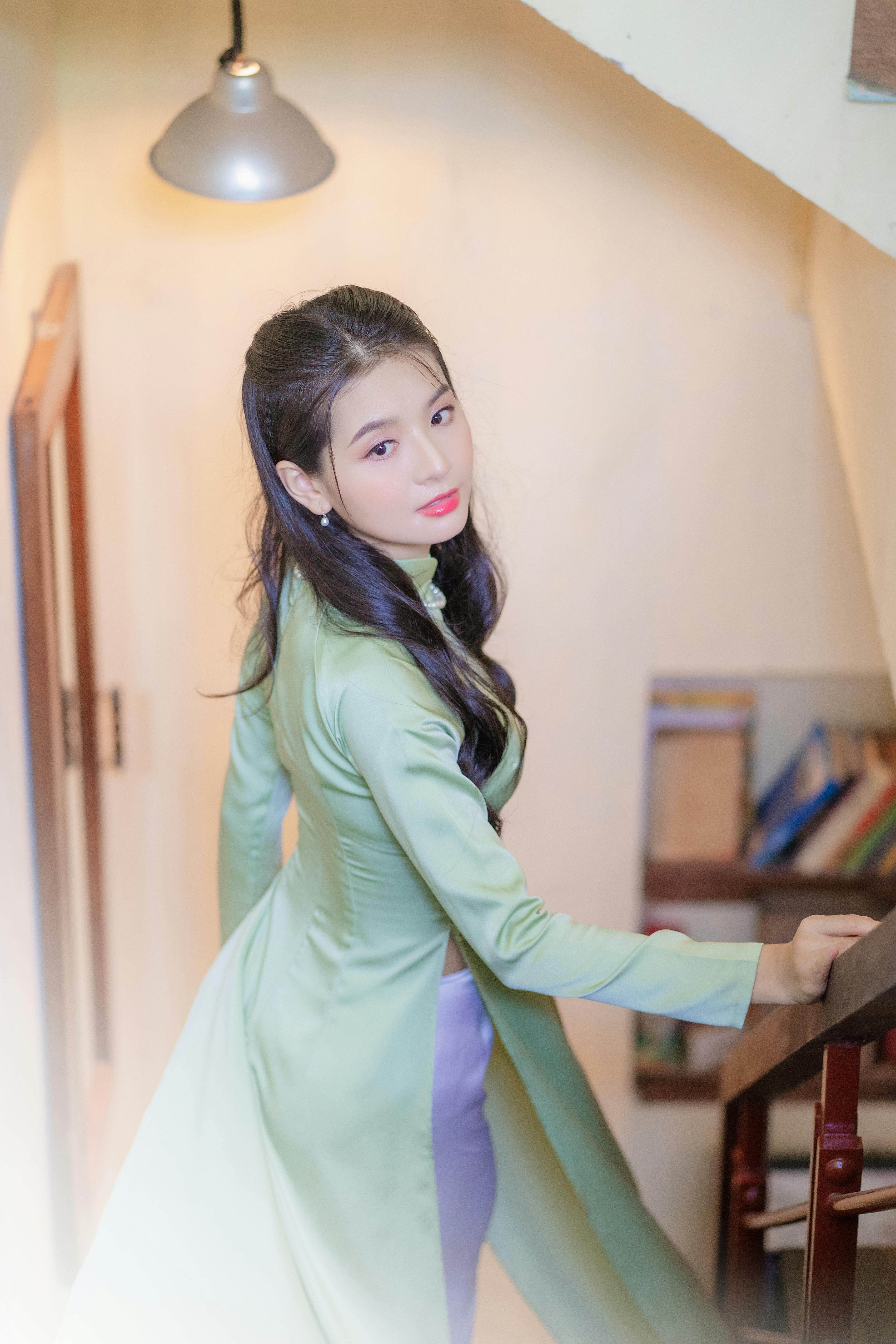 暖黄灯光与复古楼梯,把民国少女的温柔与松弛,完美融进镜头里。