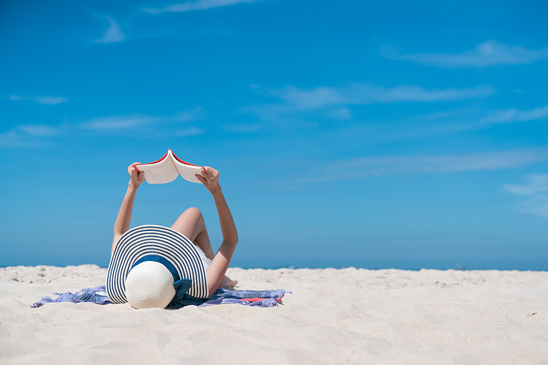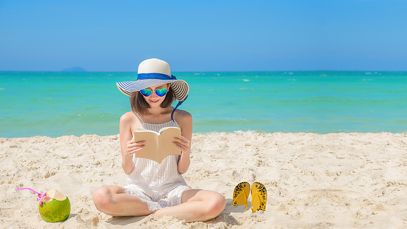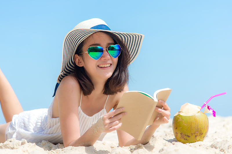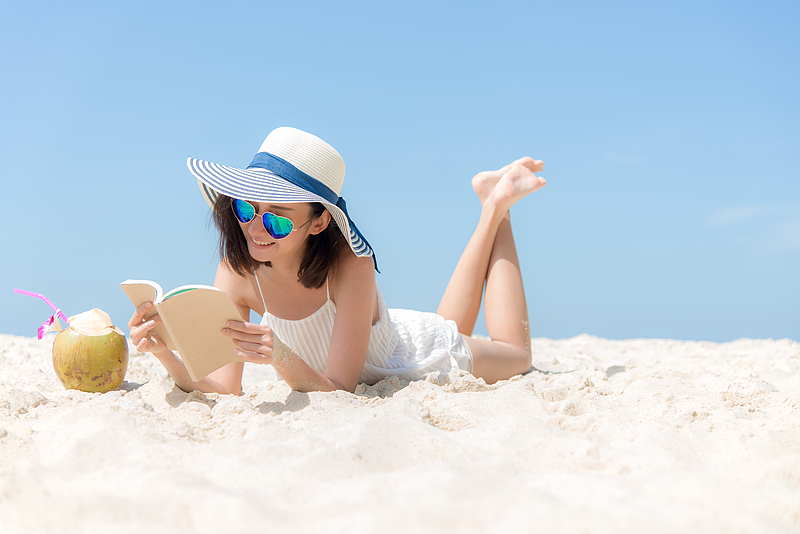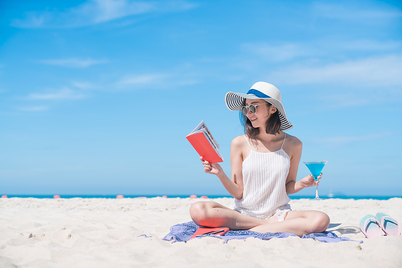 Lifestyle young asian woman relax and reading a book at the beautiful beach on holiday summer, blue sky background. Summer Concept.