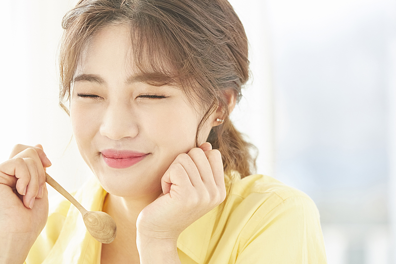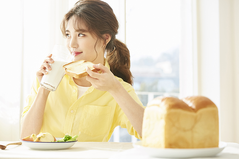 明黄色衬衫衬得人元气满满,左手牛奶右手吐司,一口绵密一口醇香。