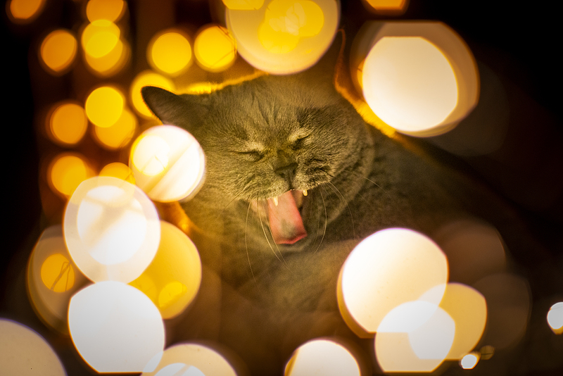 灰蓝绒毛被暖光晕染,舌头粉嫩,眼神半眯,像刚睡醒的小天使。