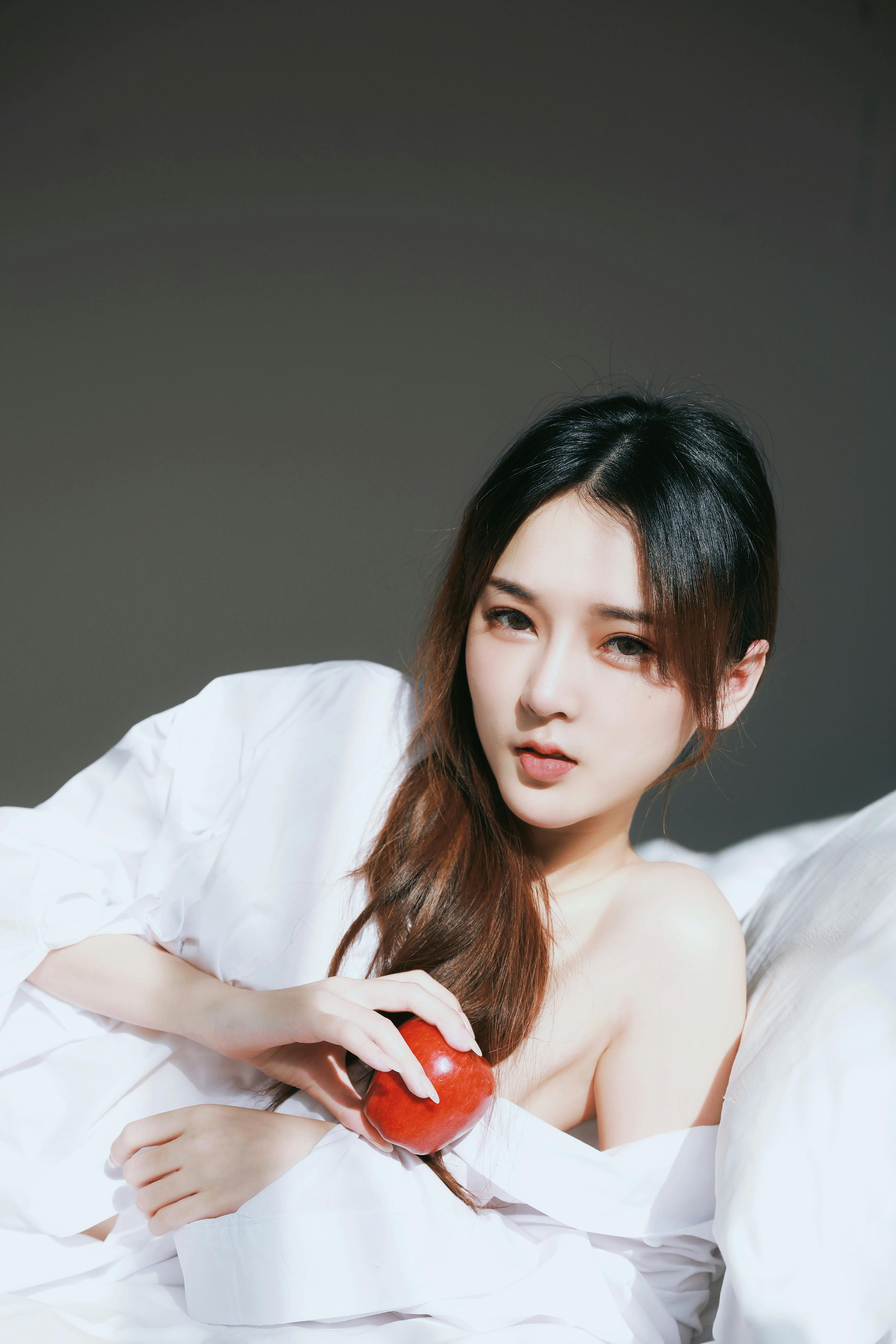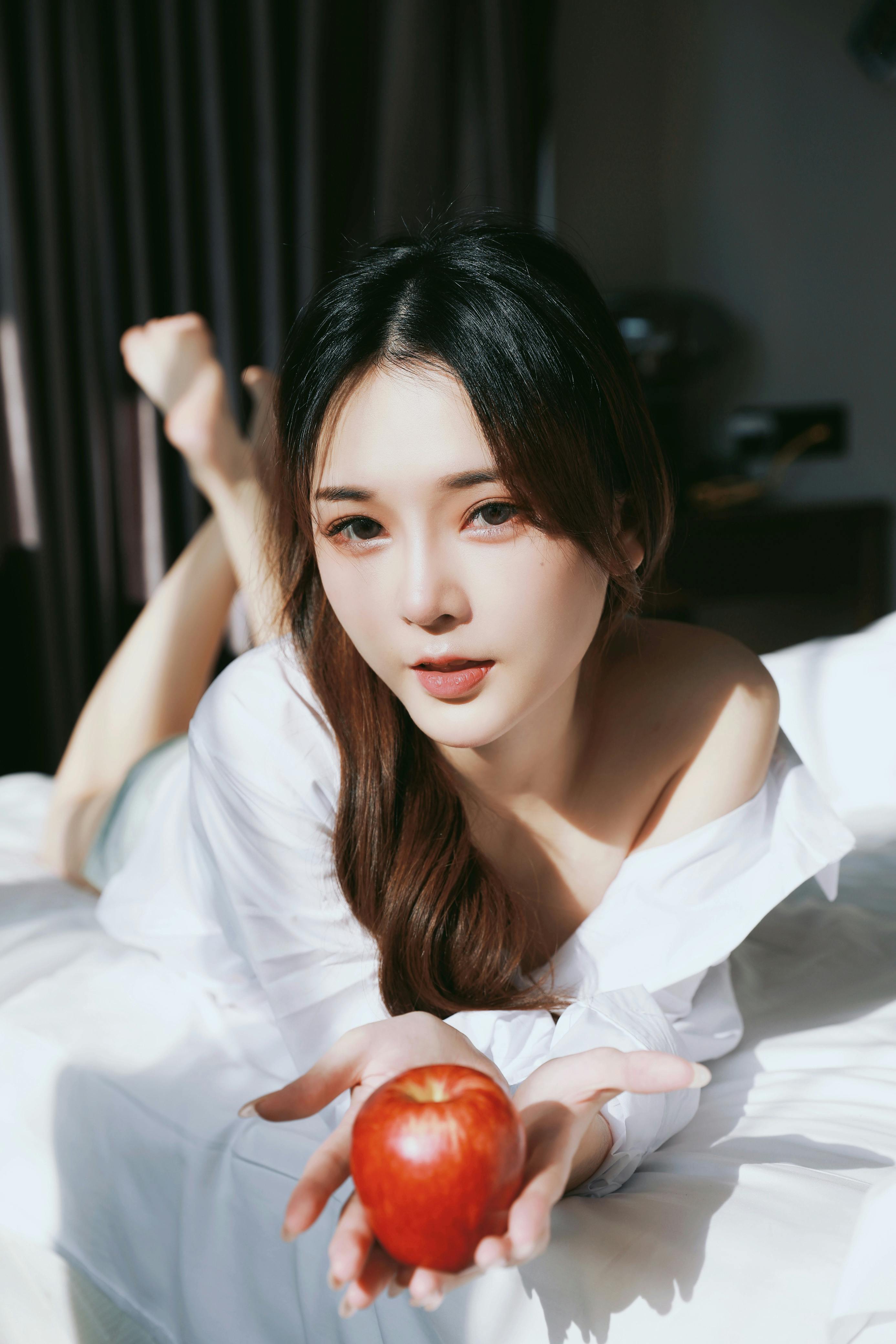她或是卧在床榻,指尖轻触苹果,眼神清澈又迷人;