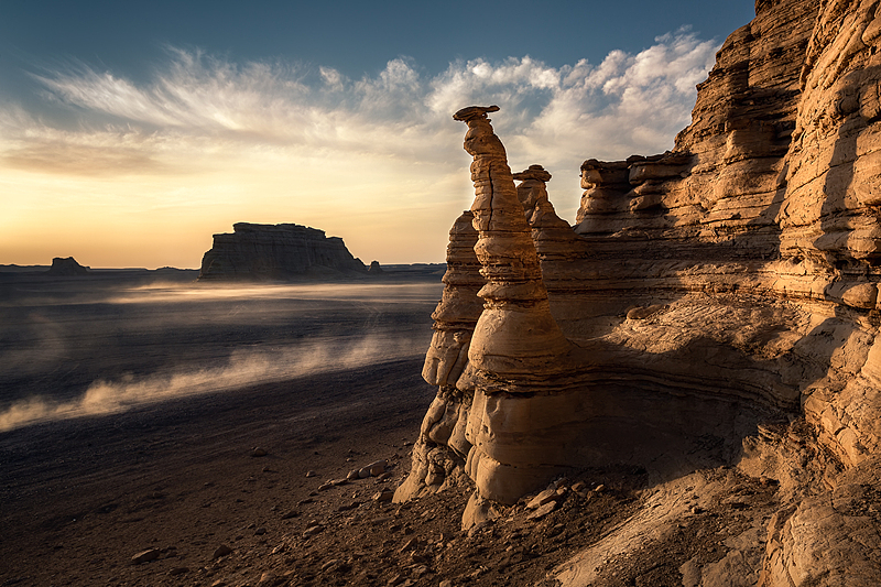 地貌特色:世界规模最大、发育最成熟的雅丹群落。面积约 400 平方公里,垄岗、墙状、塔状雅丹密集分布。著名景观 “西海舰队” 如巨型舰队列队挺进沙漠。风蚀造型惟妙惟肖(狮身人面、孔雀开屏),大风过境发出怪啸,故称 “魔鬼城”。