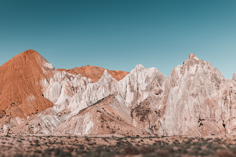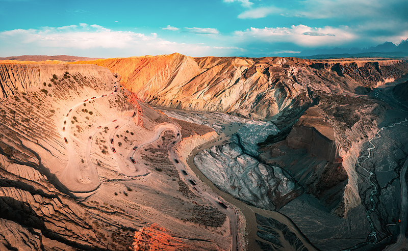 地貌特色:天山雪水(安集海河)千万年冲刷形成的彩色峡谷。长 20–30 公里、深达 400 米。崖壁因矿物质差异呈现红、黄、青、灰等斑斓色彩,谷底辫状河流蜿蜒如蓝丝带。地貌刚柔并济,被称为 “大地的绚丽伤痕”“上帝的调色盘”。