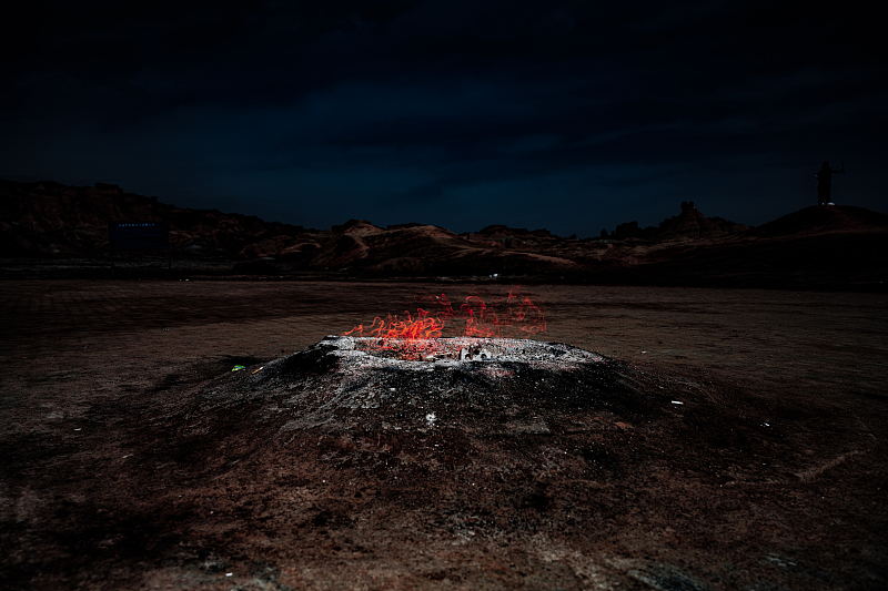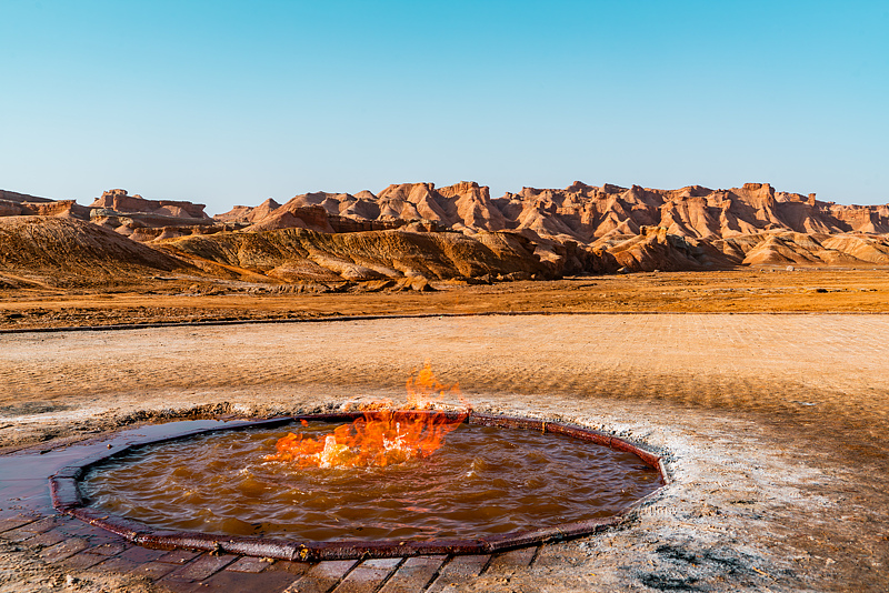 地貌特色:水火共生的地质奇观。地下丰富的天然气沿地层裂隙上升,在泉水坑口遇氧燃烧,形成“水中冒火、火在水生” 的绝景。火焰常年不熄,泉水微温咸涩,周围是红褐色的雅丹戈壁,寸草不生,荒凉如外星地表。