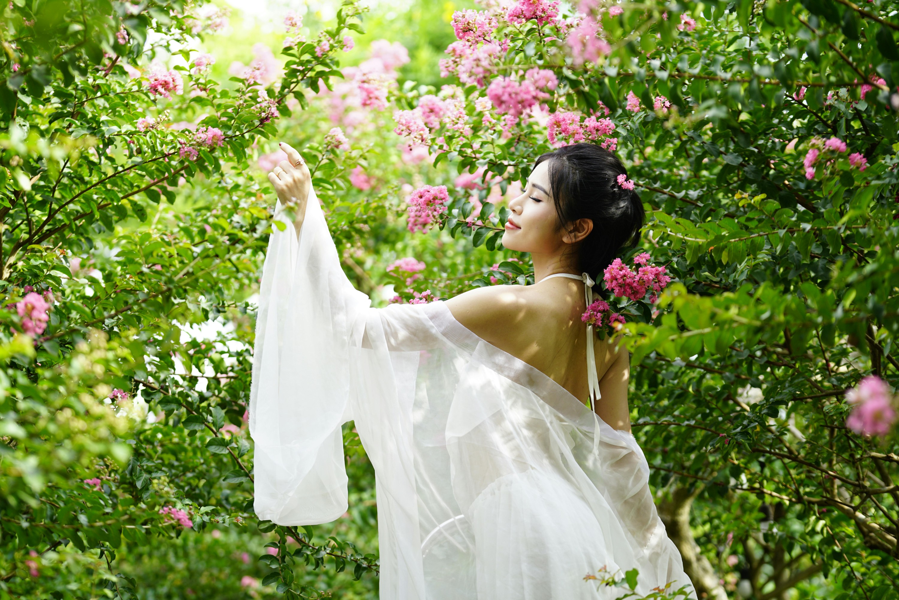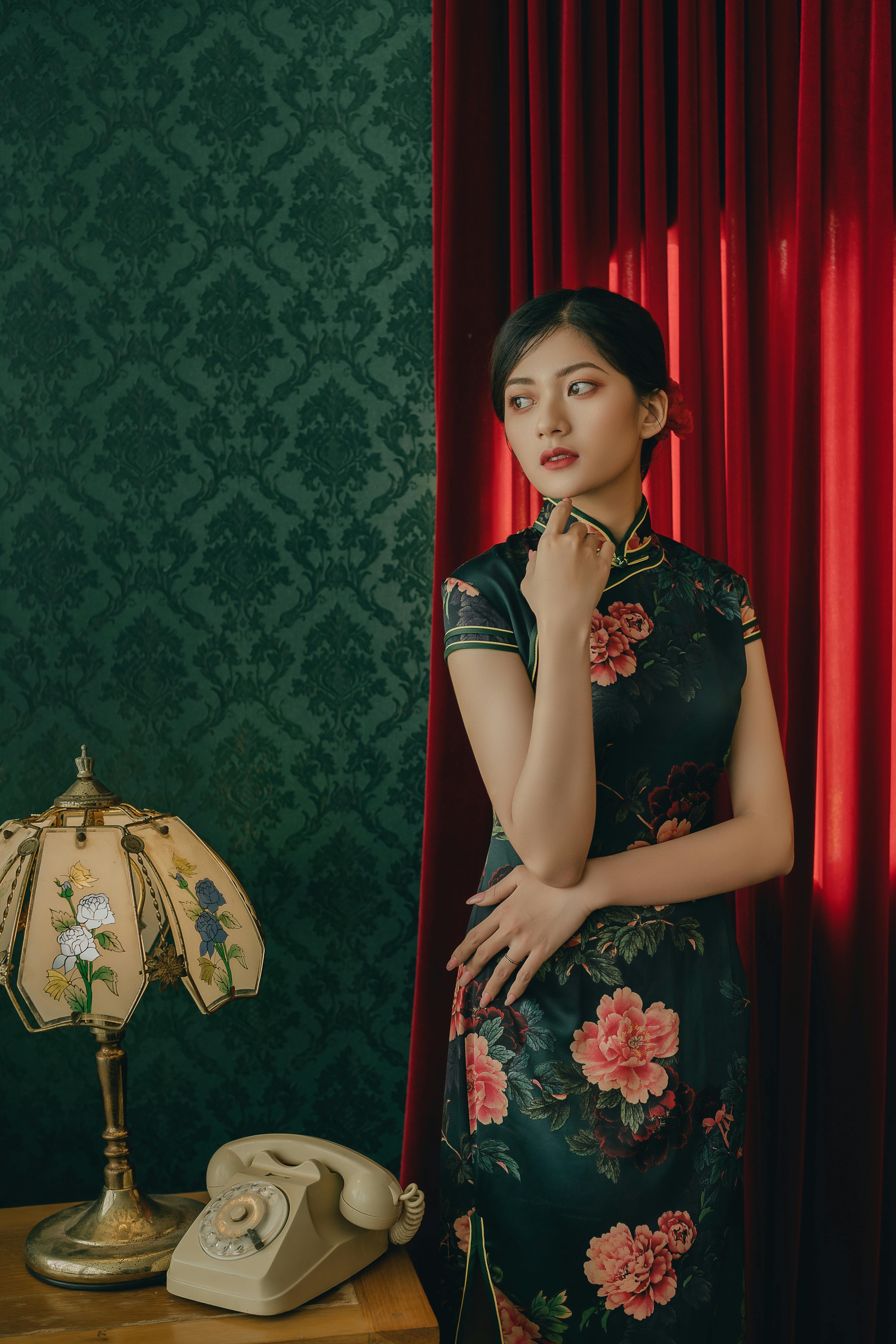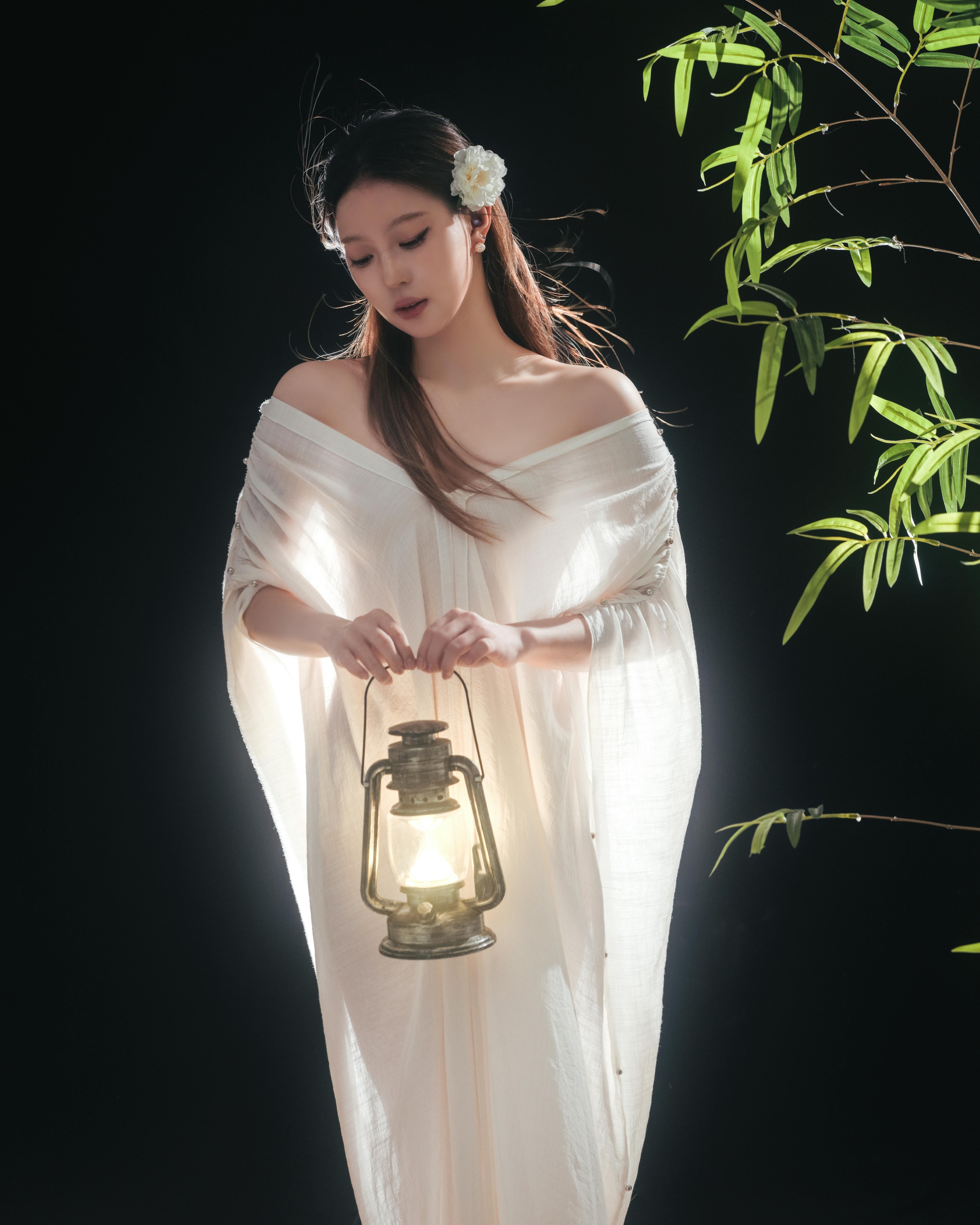 一边是民国旧梦:墨绿暗纹墙前,墨色牡丹旗袍勾勒出玲珑身段,复古台灯与老式电话,将时光拉回那个摇曳生姿的年代;米白蕾丝旗袍配木扇,竹影婆娑间,是江南女子的温婉与雅致,一颦一笑,皆是岁月沉淀的风情。另一边是仙系古风:白纱轻笼,花影扶疏,林间摘花的少女,似从诗画中走来;持盏提灯的光影里,是不染尘俗的仙气,每一缕发丝都带着诗意,每一个姿态都藏着风骨。