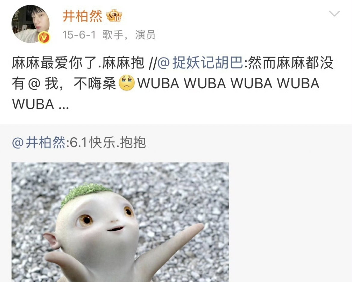 而这个昵称能一直火到现在,还得多亏当年官方的玩梗和双向互动。电影宣传的时候,胡巴的官方微博就天天喊井柏然“麻麻”,不光母亲节会给她送祝福,井柏然生日的时候,还会特意发文“我最亲爱的麻麻生日快乐”,甚至写小诗送给“麻麻”。
