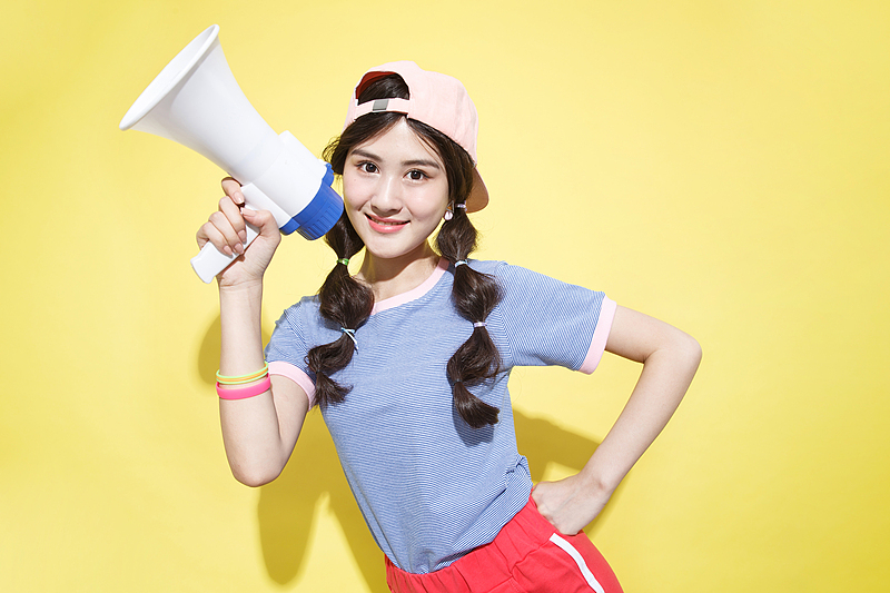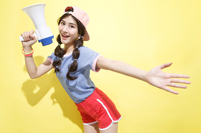 是举着喇叭、张开双臂拥抱阳光的元气少女,