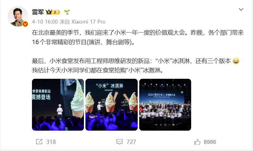 近日,小米在年度价值观大会上正式推出全新自营食品项目——小米冰淇淋。该产品由小米食堂团队主导研发并率先在内部亮相,标志着小米内部餐饮服务开始向品牌化、产品化方向迈出重要一步。这一消息发布后迅速引发关注,不少网友调侃称雷总又整了新活。