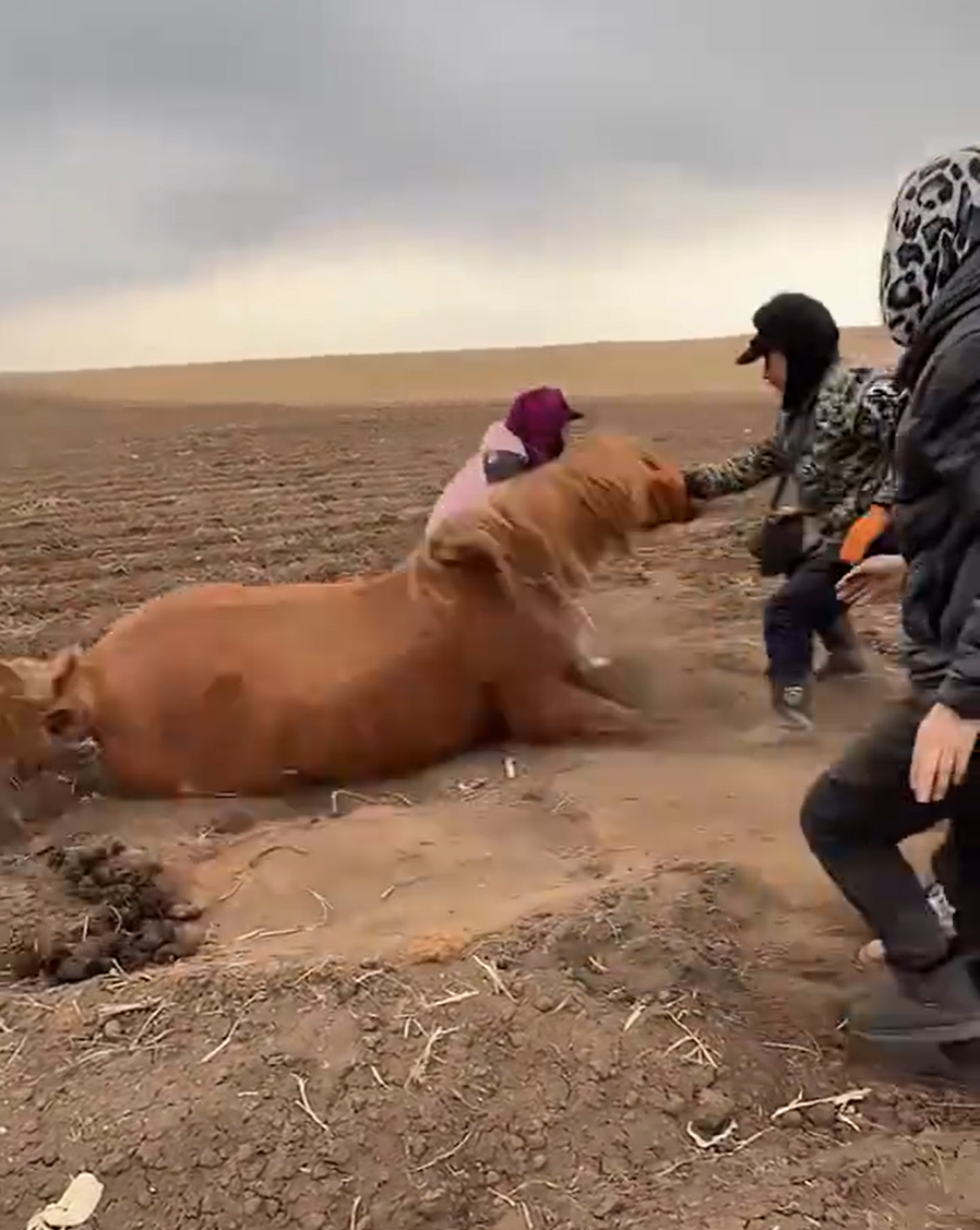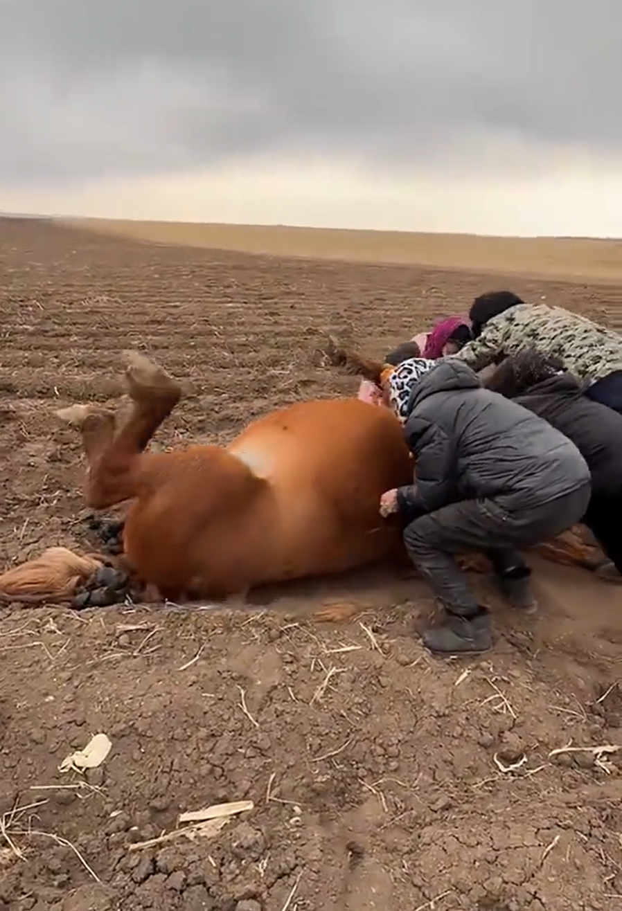 在确保自身安全的前提下,几人合力拉拽马匹身体,调整角度,一点点用力。整个过程并不轻松,马匹因紧张不断挣扎,救助者多次调整站位和力度。经过一番努力,马匹终于被成功翻身,重新站稳在地面上,脱离了地垄的束缚。