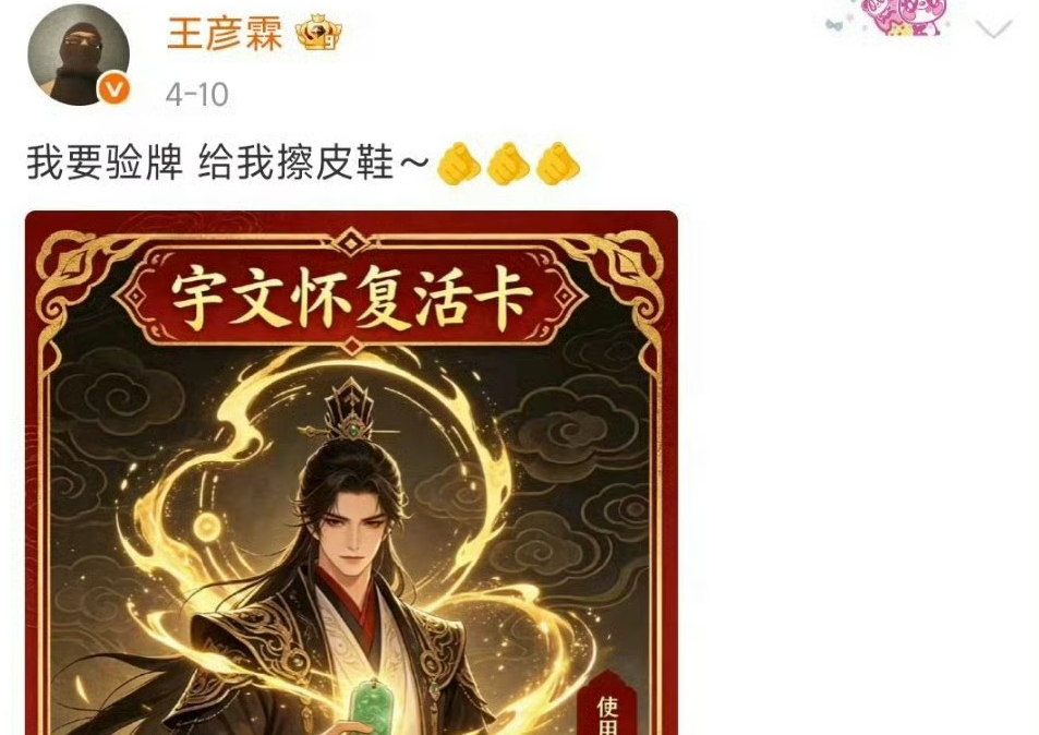 紧接着,下午5点55分,王彦霖也发了动态。他玩起了自己当年饰演的反派宇文怀的梗,晒出“宇文怀复活卡”,还配了一句角色经典台词“我要验牌给我擦皮鞋”,瞬间勾起了大家的回忆。