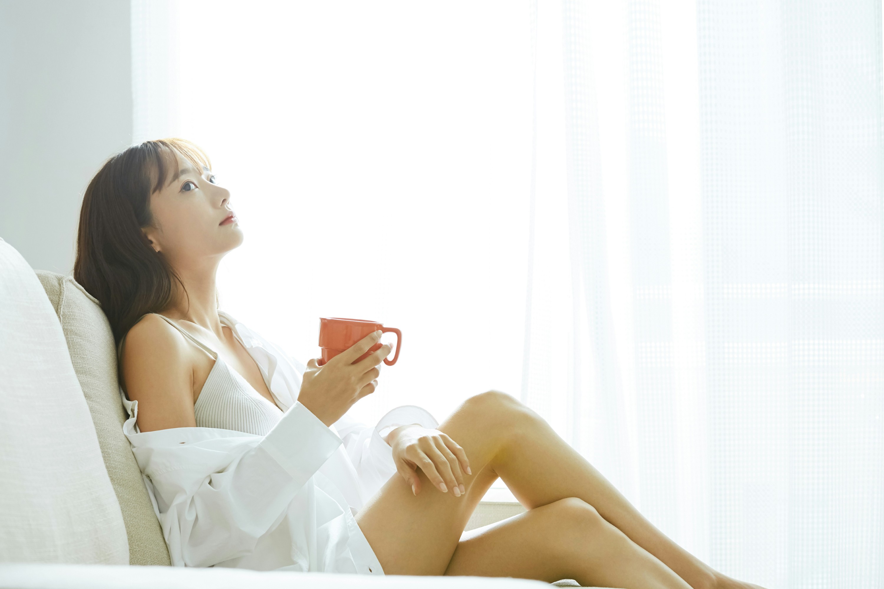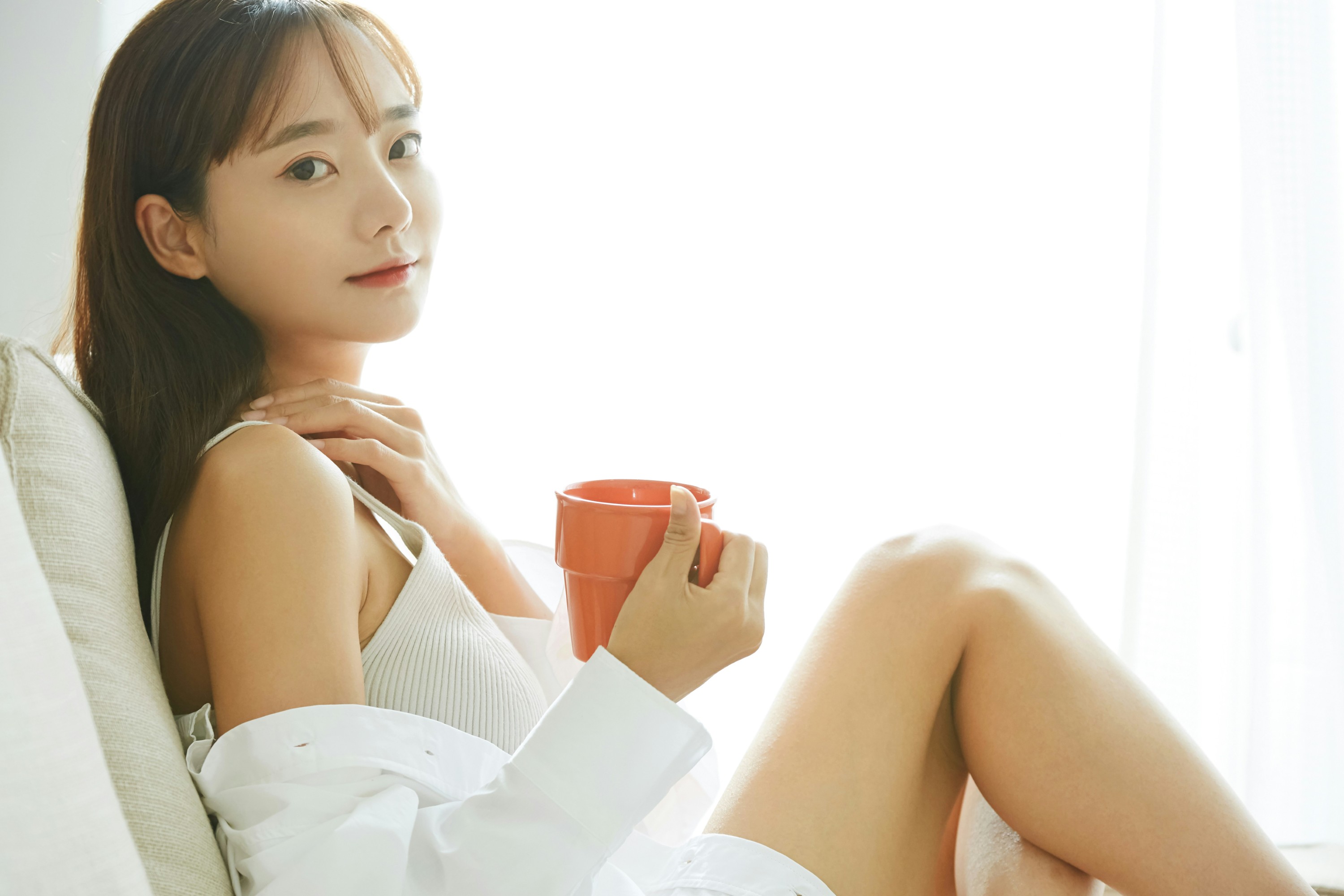 清晨的阳光透过白纱帘,温柔地铺满整个房间。她穿着宽松的白衬衫,内搭简约的针织吊带,慵懒地靠在沙发上,手里捧着温热的橘色马克杯,指尖还留着咖啡的余温☕